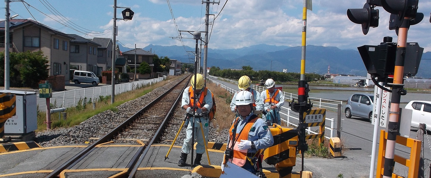 鉄道関連の測量は、測定個所の範囲が広く電車も通常通り走行します。